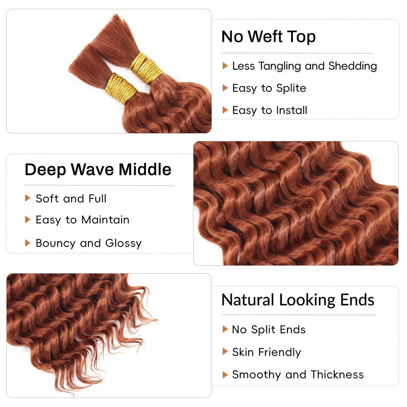 - You Will Get: Deep wave bulk braiding hair 2 bundles/pack, 100g/bundle, 200g in total. You can add more according to your needs. Stretched length: 16/18/20/22/24/26/28 inch. Color: #1B, #4, #27, #30, #350, #99j, #P4/27, #P4/30, #Red, #Orange, #1B/30, #1B/Grey, more colors will be added.
