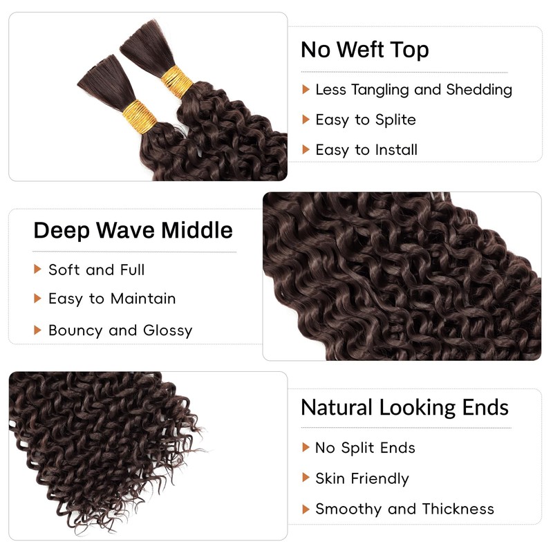 - You Will Get: Water wave bulk braiding hair 2 bundles/pack, 100g/bundle, 200g in total. You can add more according to your needs. Stretched length: 18/20 inch. Color: #1B, #4, #27, #30, #350, #99j, more colors will be added.