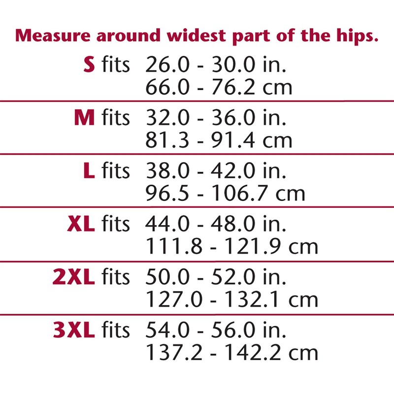• Measure by circumference of the hips. Available Sizes: Small (26 to 30 inches), Medium (32 to 36 inches), Large (38 to 42 inches), X-Large (44 to 48 inches), 2X-Large (50 to 52 inches), and 3X-Large (54 to 56 inches).