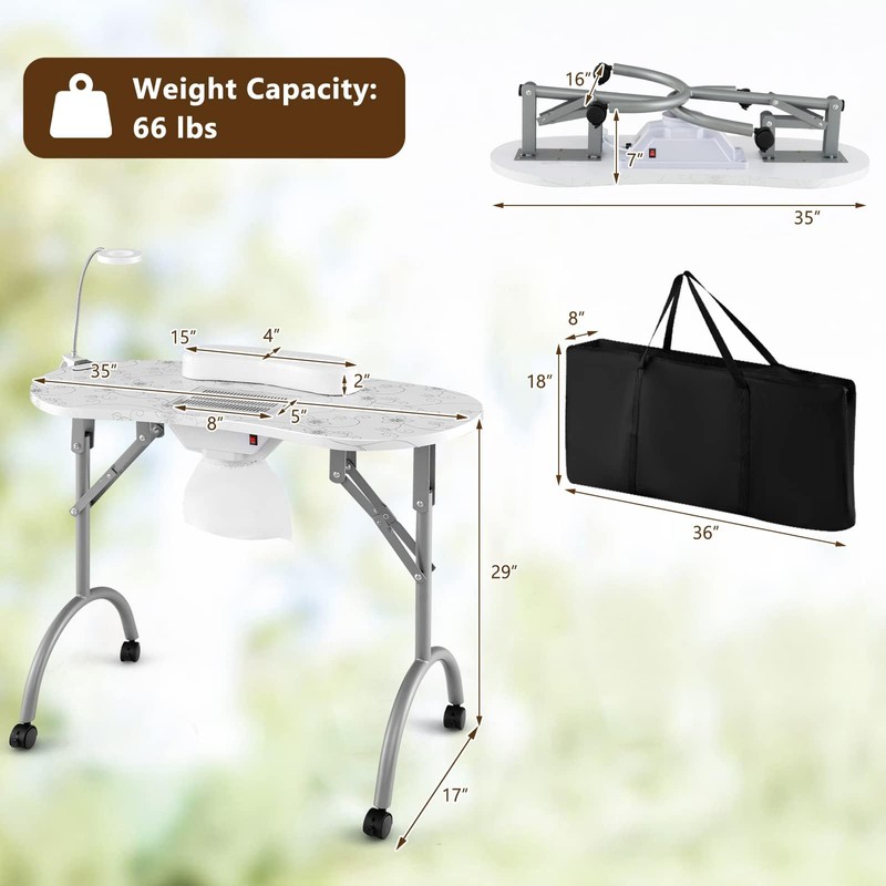 - Folding & Portable Design: Crafted with a rustproof metal frame , our manicure nail table has exceptional durability and sturdiness to load 66lbs capacity. The folding design allows you to transform the table into a compact size within seconds, making it easy to store and transport. Additionally, a convenient carrying bag is included for hassle-free portability.