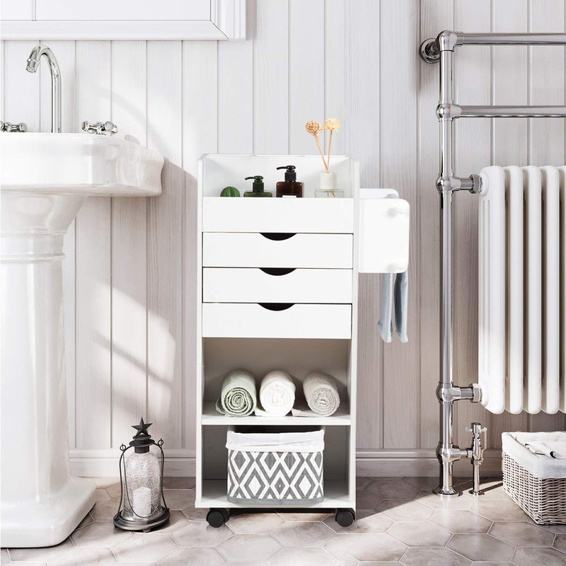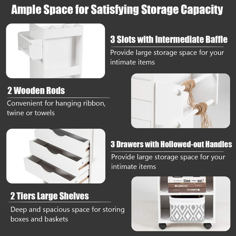 Our rolling storage craft cart adds functionality to any room in your home. It features three drawers, three shelves, two dowels, and three slots; this storage cart is ideal for storing crafting supplies and different gift wrapping paper. Whether it's wrapping presents for friends or family or doing crafts with children, you can find everything you need in one place. Made of sturdy particleboard, our storage cart is stable and durable, which has a long lifespan. Since it comes with four smooth casters, this cart is flexible and portable and allows you to craft from any room in your house. 2 lockable casters are convenient for you to stop the carriage anywhere you want. The storage cabinet is versatile in your home because of the elegant white appearance.