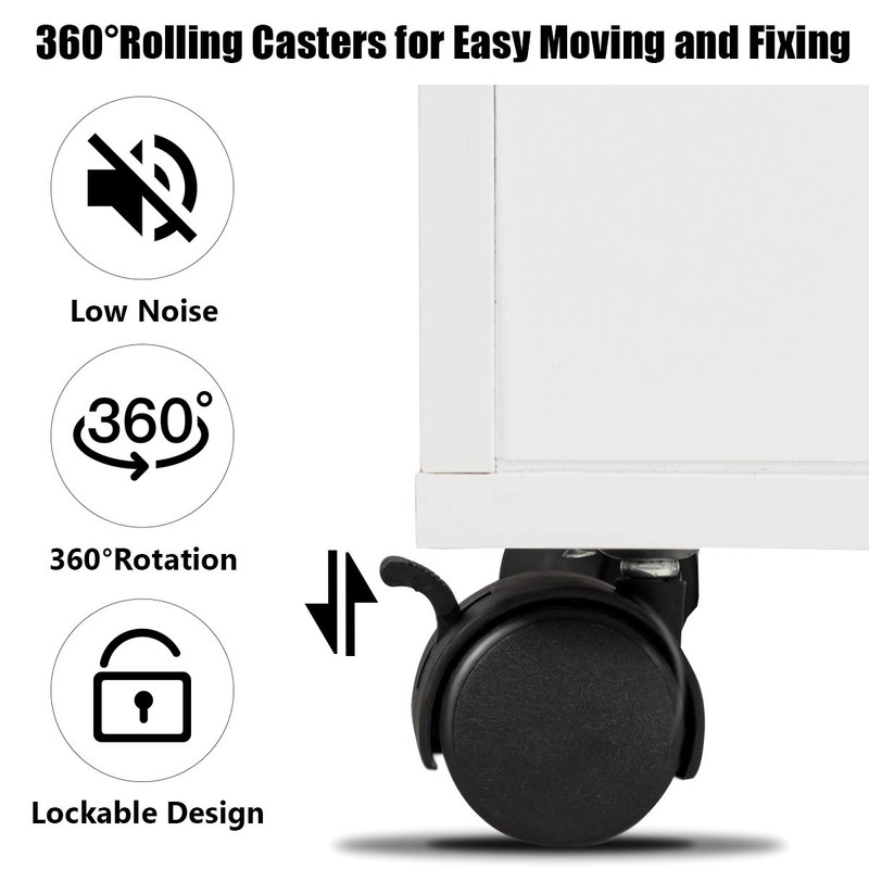 - 【Rolling Casters for Flexibility】: Equipped with four smooth-rolling wheels, this rolling utility cart can be rotated 360 degrees and move anywhere quickly. Two lockable wheels are equipped for you to roll and stop this storage cart in a specific place. The casters are made of premium material, and there is almost no noise during the rotation.
