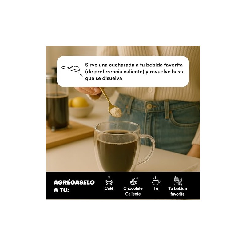 • Sin sabor, sin azúcar ni saborizantes: No altera el sabor de tus bebidas. Se mezcla fácilmente en café, té o infusiones calientes. Funcionalidad pura sin ingredientes innecesarios.