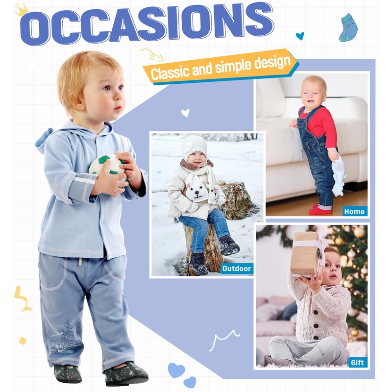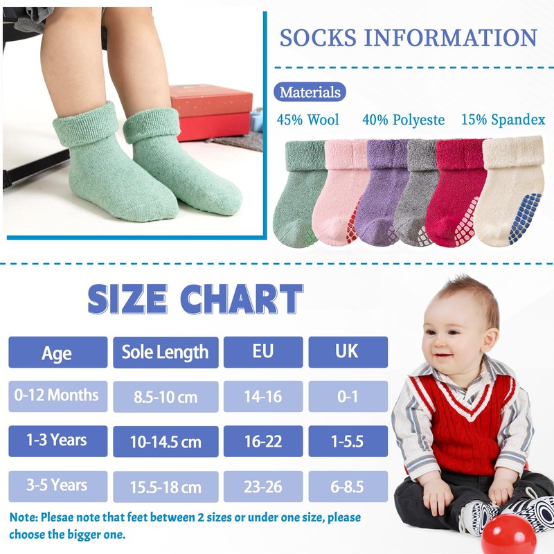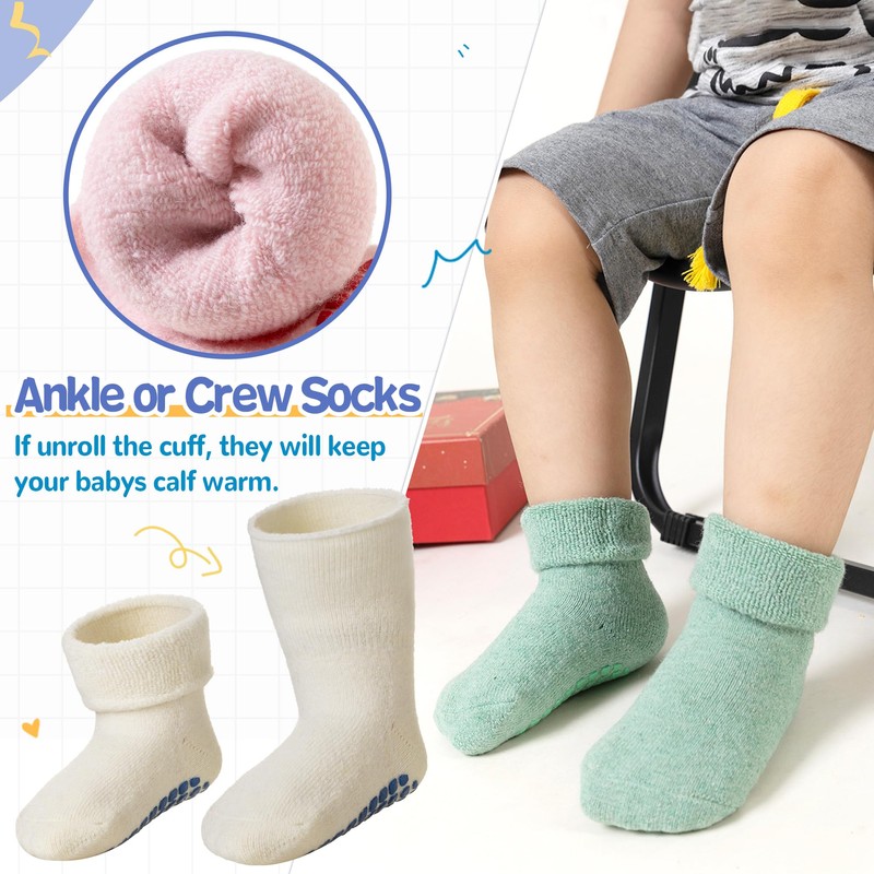 - TODDLER NON SLIP SOCKS - The bottom of the baby wool socks is designed with non-slip dots, which provide good grip on smooth surfaces. When you baby start to learn walking, anti-slip grips at the bottom of socks make them easy and safe when walking and running.
