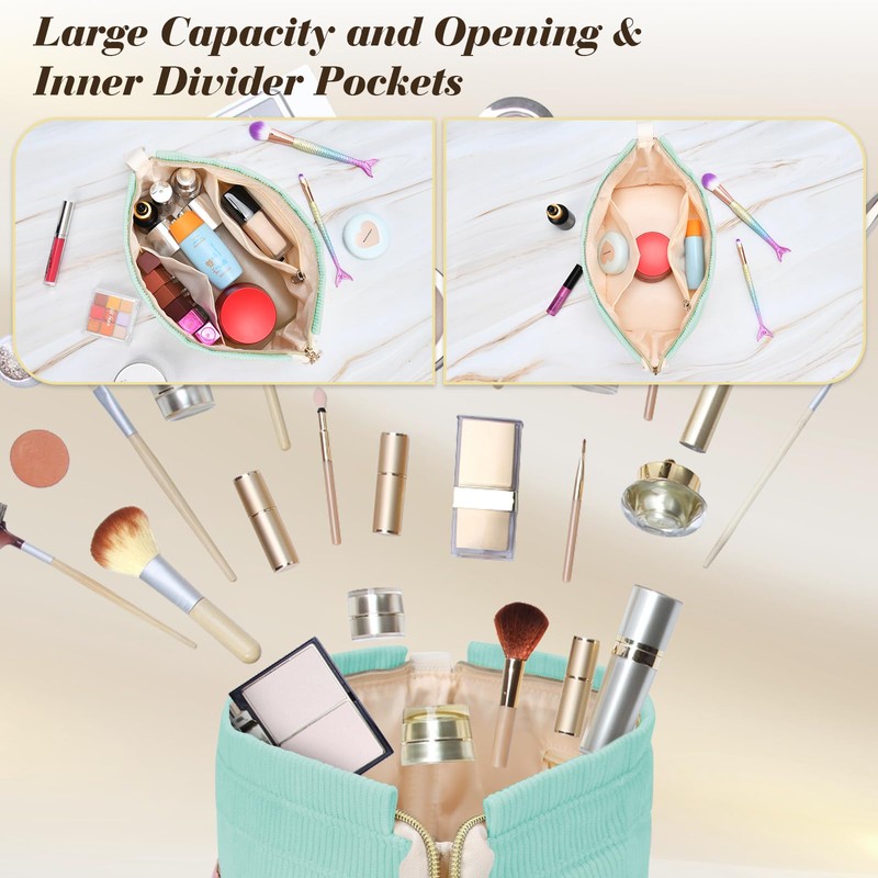 - 【Smart Storage Design】: With two main compartments, this practical cosmetic bag offers convenient organization for your makeup essentials. The top section features an open pocket and two small interior pockets for items like lipstick and earrings, while the bottom section has a large pocket for larger items like eyeshadow palettes and brushes. This unique design keeps everything clean and tidy, preventing spills and messes.