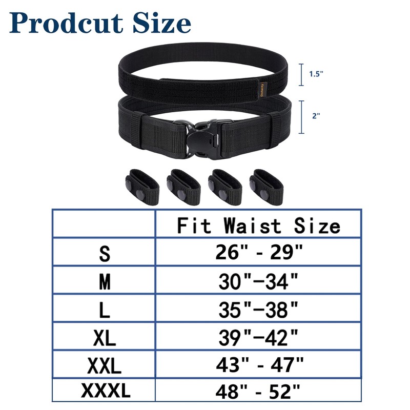 • Adjustable size law enforcement duty Belt. Dotacty duty belt is easy to adjustable length by velcro at both ends to fit your need. Available in size S(26"-29"); M(30"-34"); L(35"-38"); XL(39"-42"); XXL(43"-47"), XXXL(48"-52"). Please re-measure your Actual Waist Size before purchasing.