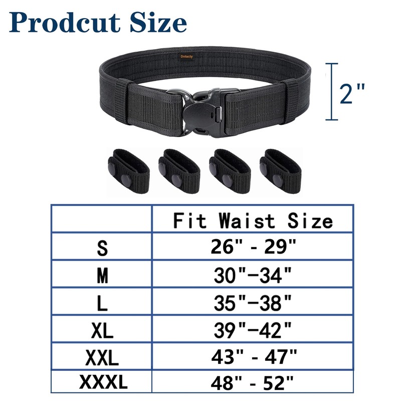 - Adjustable size law enforcement duty Belt. Dotacty duty belt is easy to adjustable length by velcro at both ends to fit your need. Available in size S(26"-29"); M(30"-34"); L(35"-38"); XL(39"-42"); XXL(43"-47"), XXXL(48"-52"). Please re-measure your Actual Waist Size before purchasing.