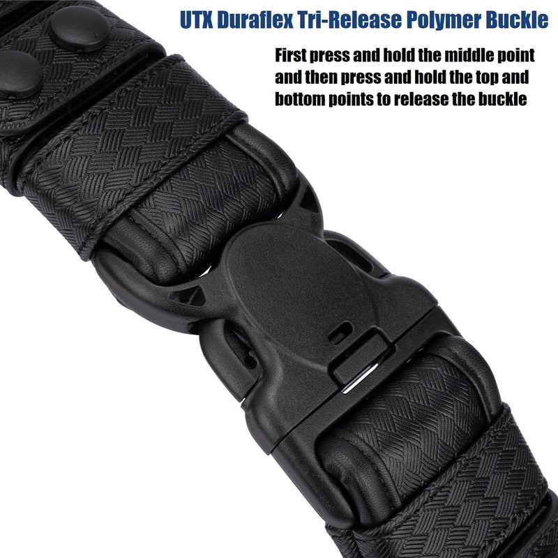• Main belt with 2 inches width and the thickness is moderate. Fits most duty use pouches/holsters with attachment loops. Durable and long-lasting leather forms a professional look and practical performance. Wear and dirt resistant. Features a Tri-Release shatter re-sistant UTX D-FLEX buckle that has a 3-point release to provide extra security from inadvertent release. It also can be used as a EDC work patrol belt alone.