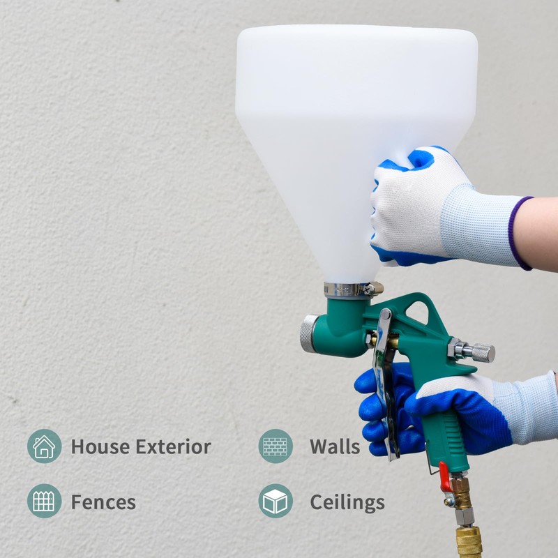 - WIDE APPLICATION: The nozzle of this texture hopper gun is precision machined for good atomization and even spray. Suitable for spraying texture on drywall and walls. It can also be used for ceilings, home decoration, construction sites, DIY and so on.
