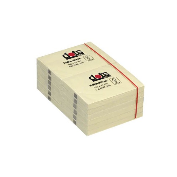 Brand dotsPackaging type with quantity1 pack = 12 blocksWidth10.0 cmLength7.5 cmSheets per pad100 sheetsDesignBlockColour light yellowAdhesionStandardApplicationProven adhesion, especially on paper.Paper weight70 g/m² self-adhesive (J/N)Can be removed without leaving any residueYRecycled paper.NoMaterial paper