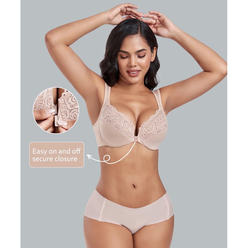 DotVol Front Closure Bras for Women Full Figure Plus Size Underwire Support Lace Racerback Wide Strap(Beige,44DD)