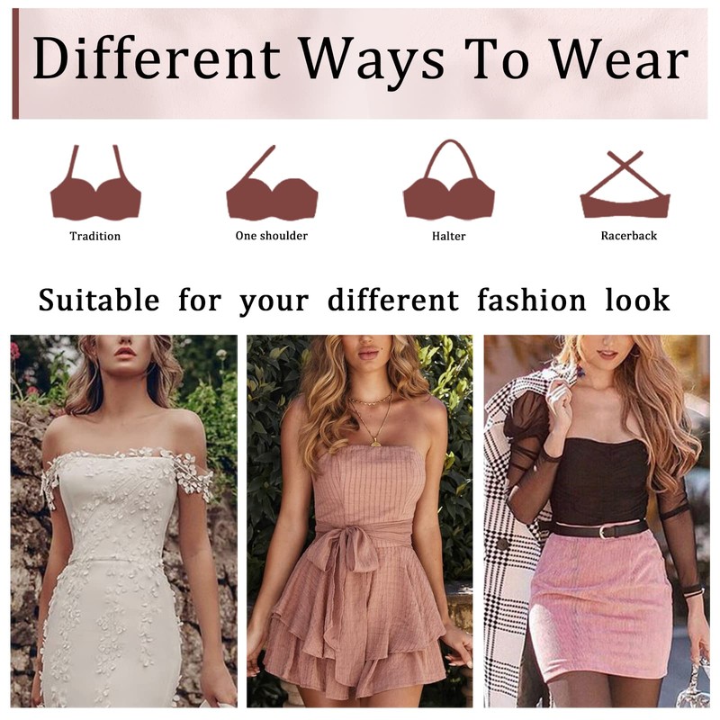 - Convertible Bra: Paired with detachable straps, straps can be worn strapless, traditional, crisscross or halter. Perfect for strapless evening dress, off shoulder dress or top, wedding, party, graduation prom etc.