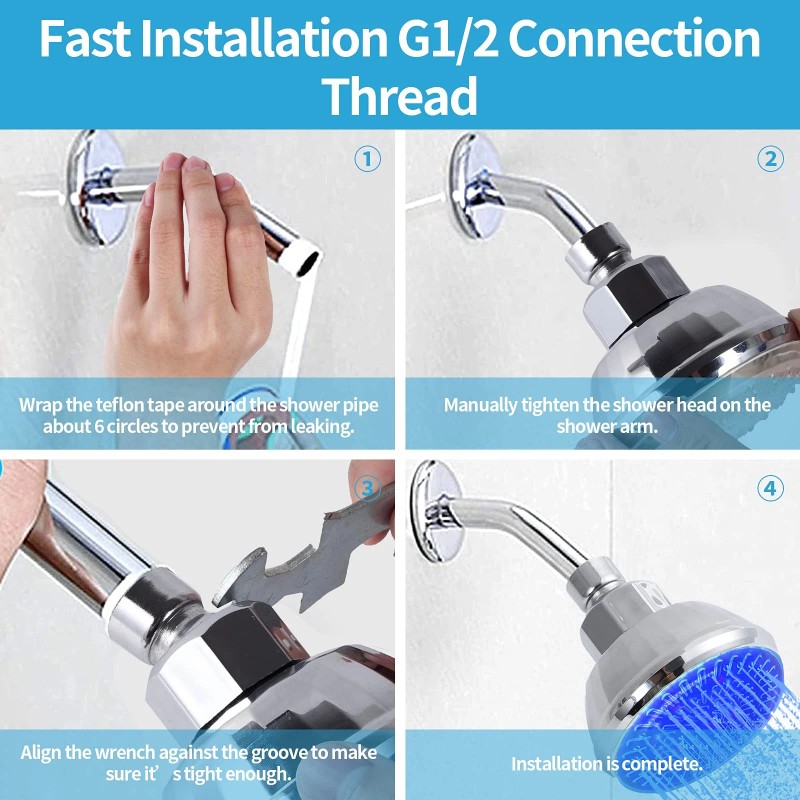 High Quality Material - The shell of shower head is sprayed with ABS chrome plating, smooth and has no corners burrs and does not fade. Long time use and will not rust. Features a hydro supercharged turbine LED, air jet design that maximizes your water pressure output performance by injecting oxygen into water flow through 48 elastic rub clean nozzles that help prevent clogging.