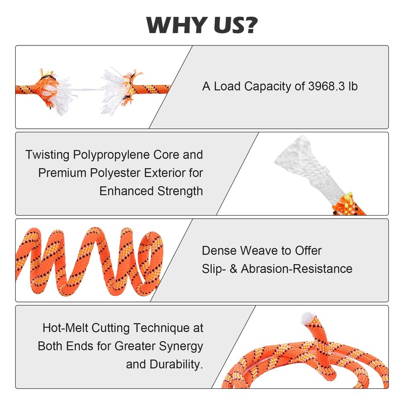 - [Reliability] Arborist rope is composed of twisting polypropylene cores and sturdy polyester exteriors,the climbing rope is reinforced to sustain up to 3968 lbs. With enhanced tensile strength, it serves as your reliable partner