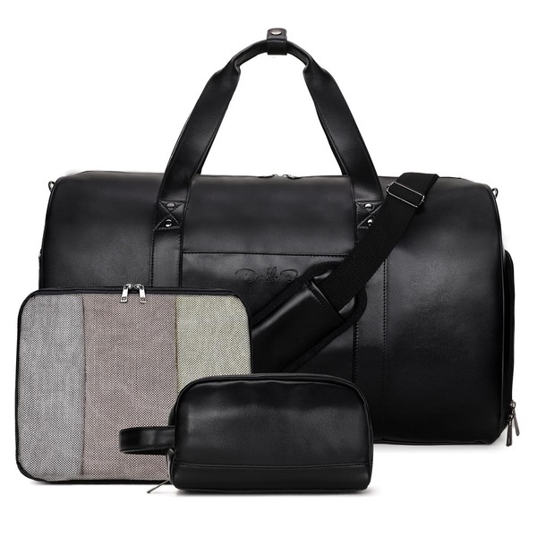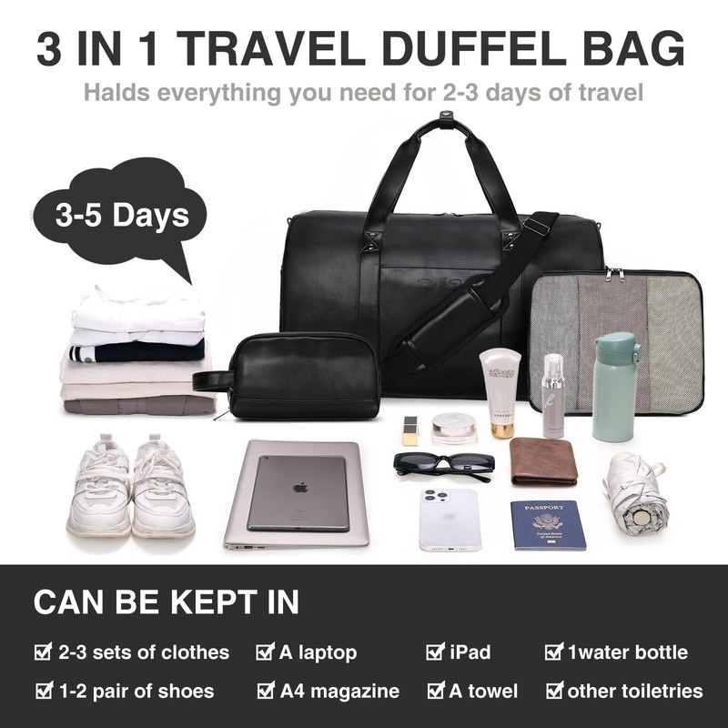 - Great 3pcs Weekender Bag: The faux leather travel duffel bag comes with toiletry bag,Packing cube,adjustable shoulder straps and shoe compartment. This mens weekender travel bag is crafted with water repellent nylon and faux leather material, Durable and not easy to wear.Perfect for men and women to use in daily travel or business trip,meet the flight regulations and requirements for carry on luggage.