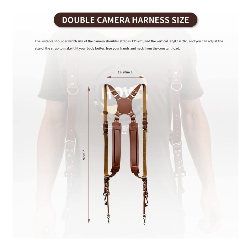 - BRASS MATERIAL LATCH:The Dual Camera Harness uses brass material locking clasp,designed as a necessary safety device with double secure hooks for your camera.