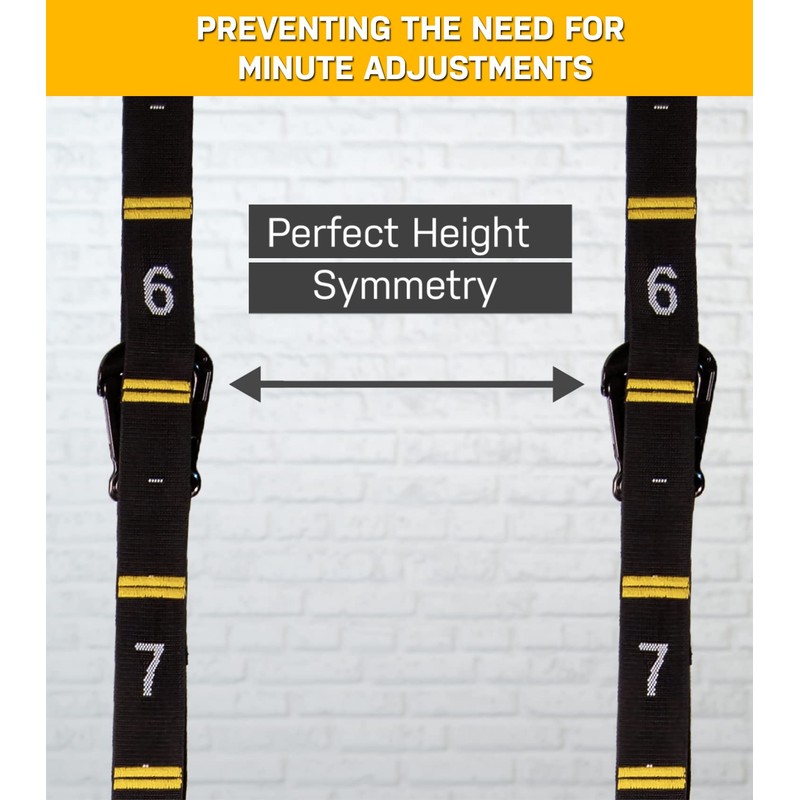 - [ Ultra Convenient Straps ] Our Olympic rings are very easy to install and they have premium quality ultra-convenient 1.5” strong straps.The straps comes complete with 4 extra strong carabiners instead of the regular cam buckles.The carabiners and the numbered hook system allows for 4" adjustments; this allows for exacted lengths, preventing the need for minute adjustments.