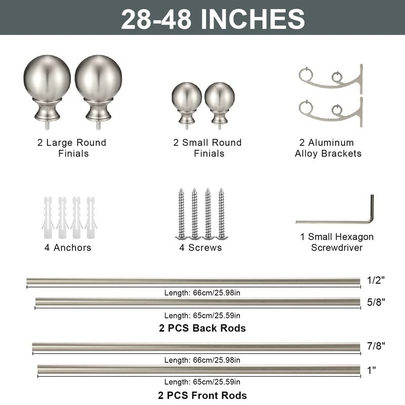 - DOUBLE CURTAIN RODS 28-48 INCH: Made of durable metallic iron, 1" diameter on front rod for the main thick panels; 5/8" diameter on back rod for sheer panels. Double curtain rods constructions creates a layered look, add elegant to your windows and decorate home perfectly.