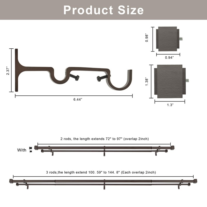 - 【Adjustable Length】The double curtain rods are consist of 1inch +7/8inch diameter large rods, and 5/8inch+4/8inch diameter small rods, put them together respectively, adjust the overlap length to accommodate to different size windows. There are 36-72” and 72-144” size option in our store. The rods length and installation, pls refer to the detail page.