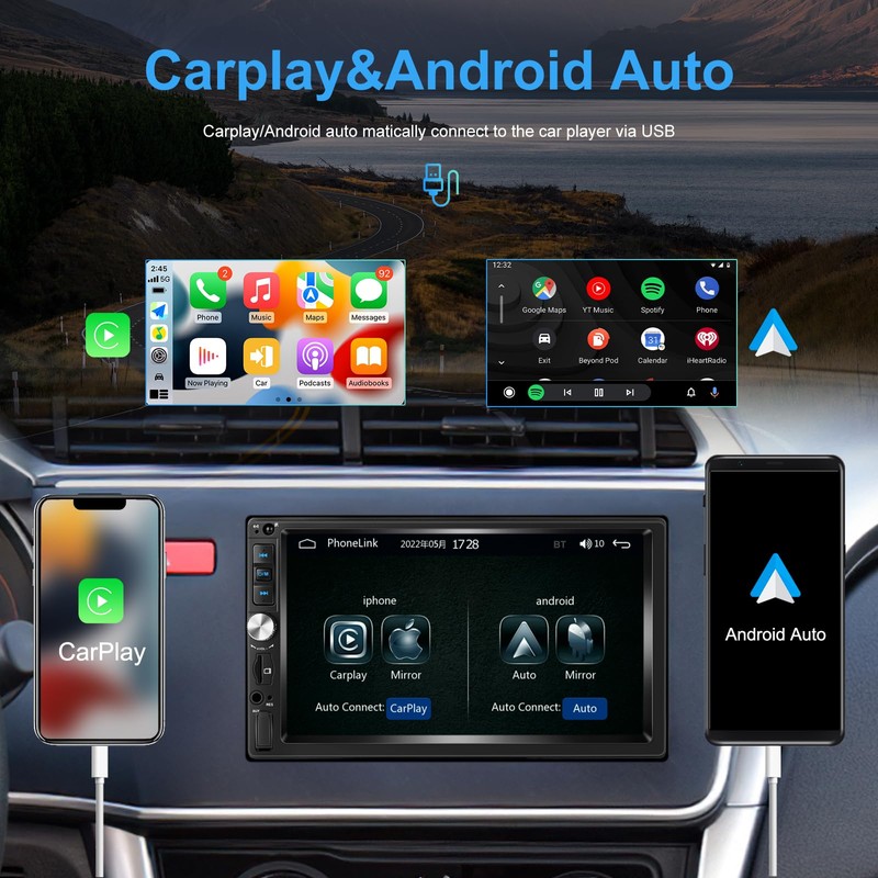 • 【Double Din Radio with Carplay Android Auto Mirror Link】 The installation size of this 7 inch touch screen car radio is 178(L)*105(H)mm*64mm(W). Please compare the size with your center console before purchasing. This double din car radio with wired carplay and android auto, after connected, you can access map, GPS navigation, phone contacts, email, notification, music and more
