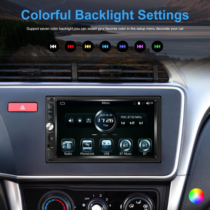 • 【7 Color Light &Steering Wheel Control】 This 7 inch double din car radio support 7 color lights, you can choose your favorite color. It also supports steering wheel control, you can switch songs adjust the volume and answer the phone through the steering wheel, it is very convenient and makes you more focus on driving