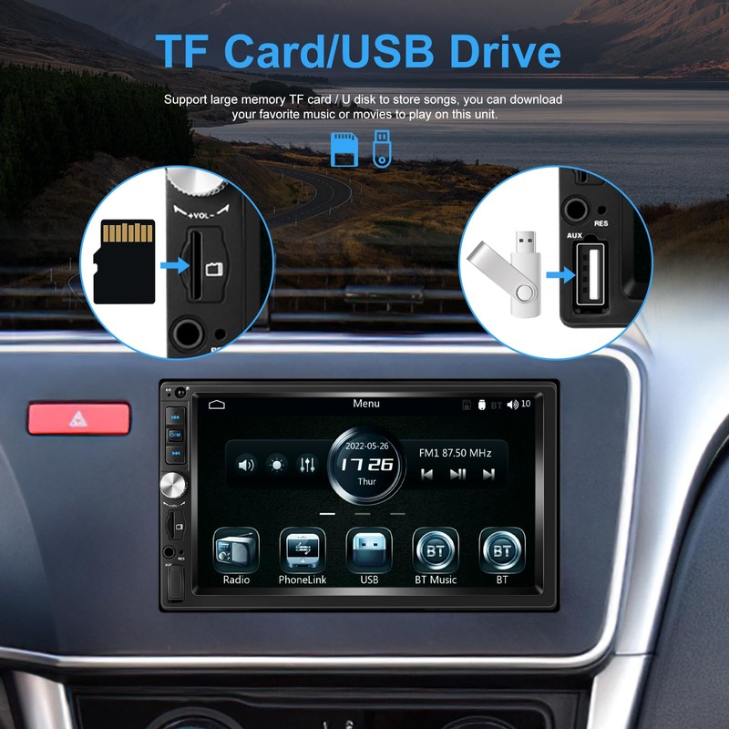 • 【Phone Mirror Link & USB AUX TF】 This Multimeida player supports mirror link via the USB cable connection, the Head Unit Car Radio will display the content from your cellphone screen synchronously, you are able to access high quality pictures, online gps navigation, messages, internet, video player and music together in the your car. This double din touchscreen head unit supports USB AUX TF, you can play music or transfer files and videos in different ways