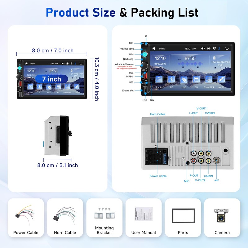 - Safety & Convenience Features: For added safety and convenience, this double Car Stereo comes with a rearview camera. It provides a clear view of the area behind your vehicle, aiding in safe parking and reversing. The steering wheel control function allows you to access key functions without taking your hands off the wheel. You can easily adjust the volume, change tracks, and manage calls while keeping your focus on the road.