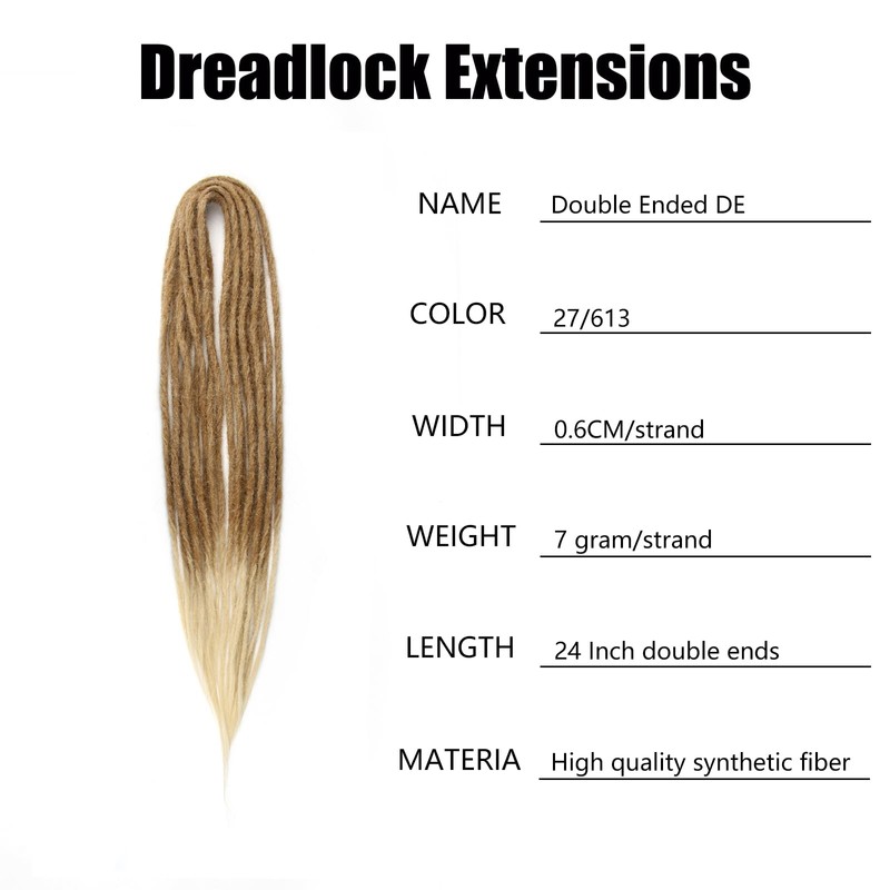 - Dreadlock extensions are 24inch double ends, 48inch extension lengths , 7 gram/strand , 10 strand/lot , There are many colors for you to choose , Mixing and matching different sizes and colors will bring more surprises !