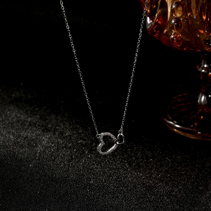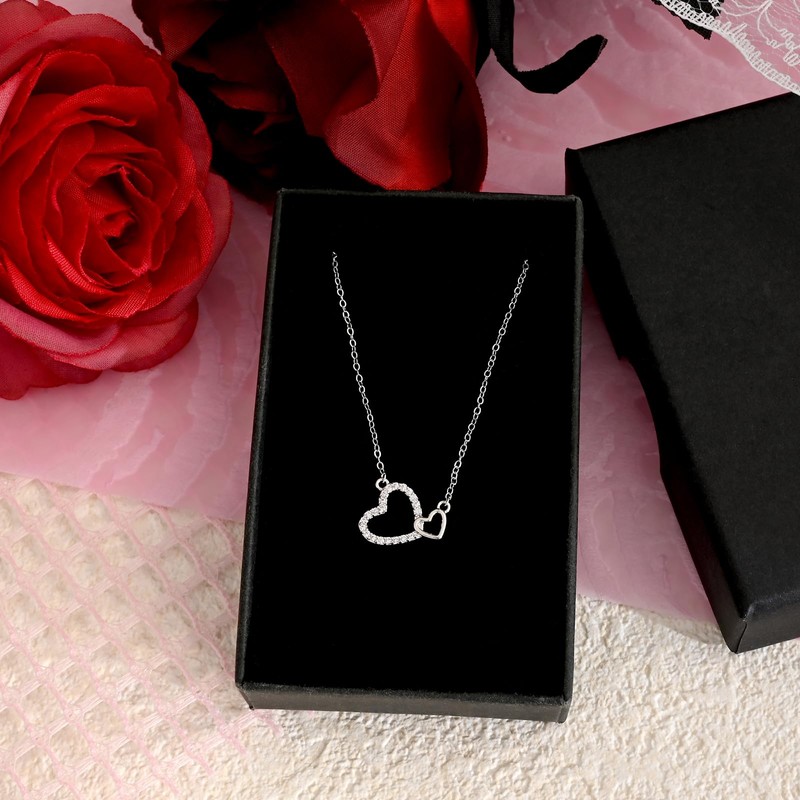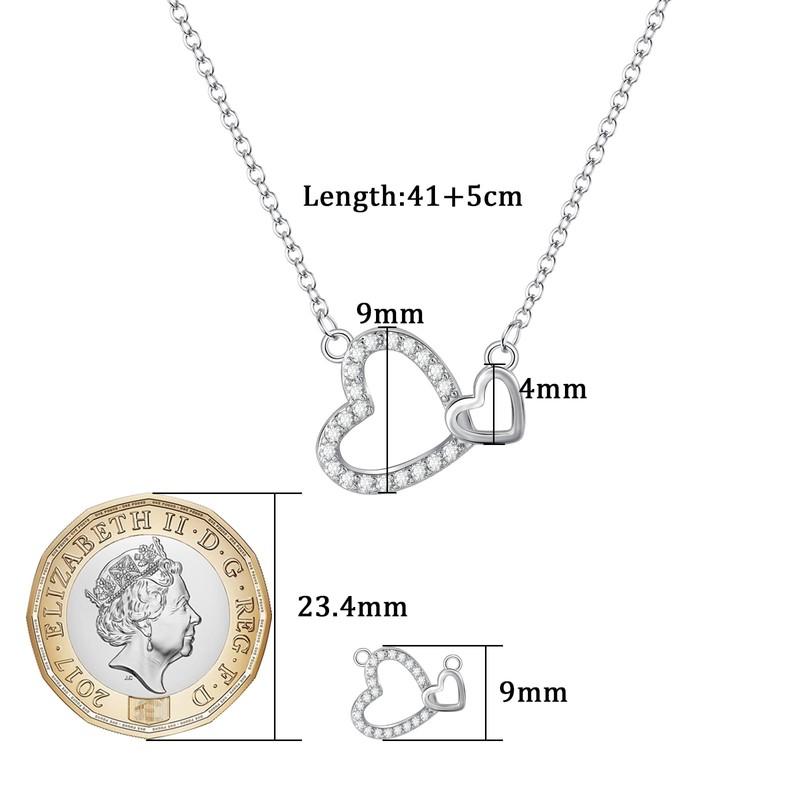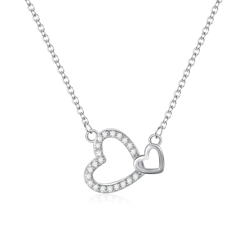 Double Heart Pendant Necklace, Silver Plated Chain, Cubic Zirconia Crystal Inlay