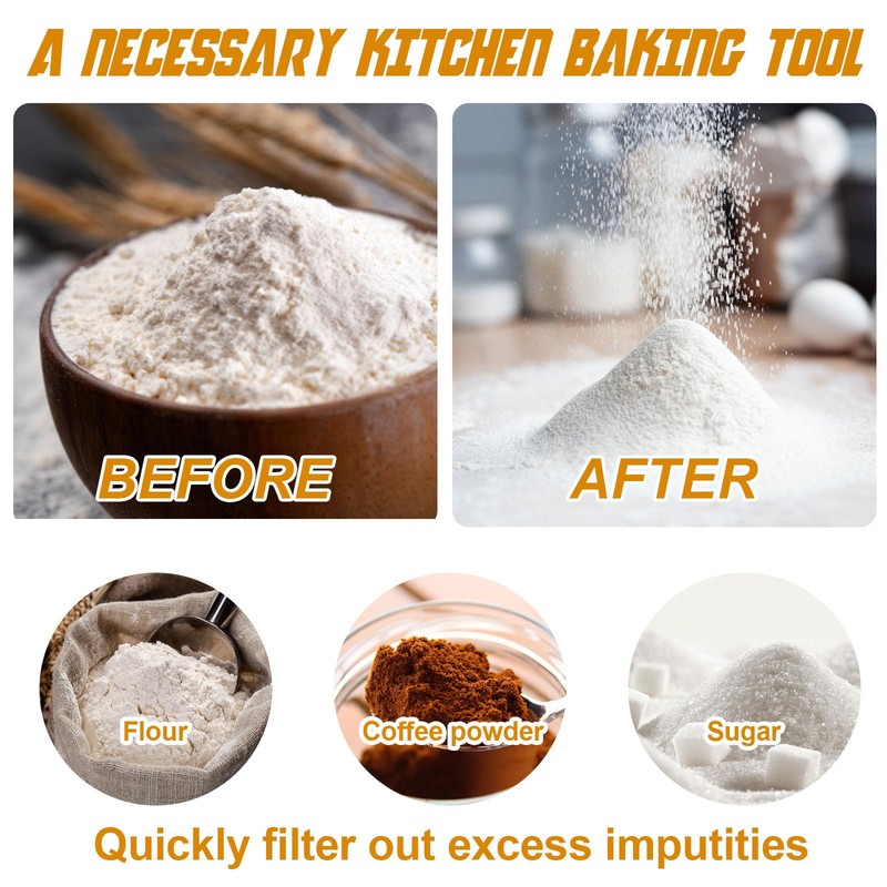 - 【Double Layer Fine Mesh】 Adopting double layer filter design, it can sift flour, sugar, cocoa and other kinds of ingredients better. When you use our sifter strainer, you will find that the sifted powder is more delicate than ordinary single-deck powder sifter.