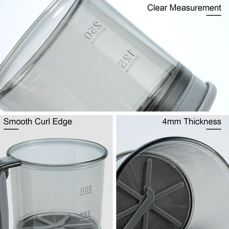 ✿Measurement & Lightweight: A clear scale is marked on the transparent cup so that you can check the exact amount to be used. The overall weight of the sifter for baking is lighter, making it less tiring to use and improving your baking efficiency.