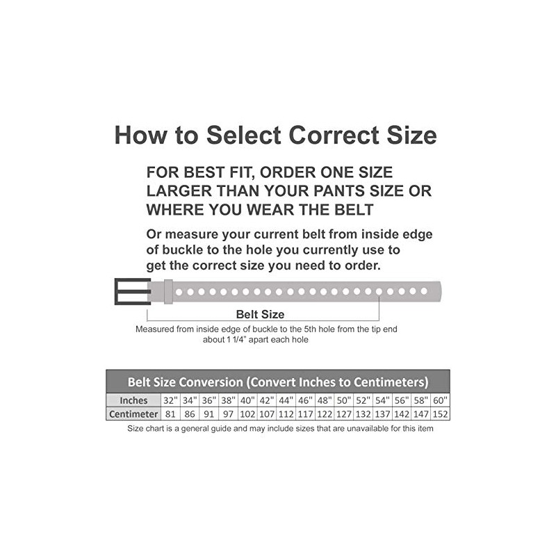 - Sizing: belt size is measured from inside edge of the buckle to the 5th hole from the tip end, order one size larger than pants size for best fit, e.g. 32" waists take belt size 34"