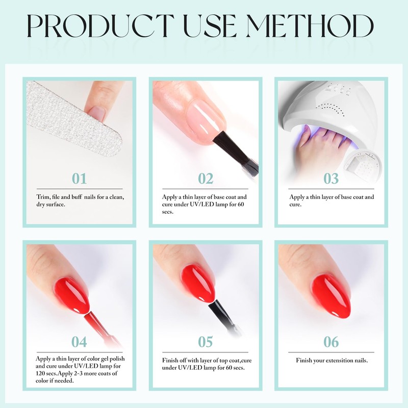 - Same Color Same Bottle GEL POLISH: 1 pc 15ml gel polish for all season, need to be cured under UV or LED Lamp for 60-120s. Must apply with Base Gel and Top Coat. Please shake the bottle or warm it with hot water before use, to acheive a better effect.