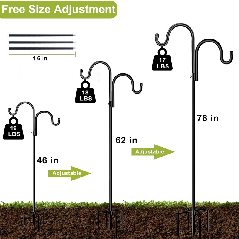 - 【Freely Adjustable Height】:The outdoor garden hook holder holds up to 17lbs,Each plant hanger includes 3 extender pole with a length of 16 inches and the height can be adjusted according to your requirements (78", 62" or 46").