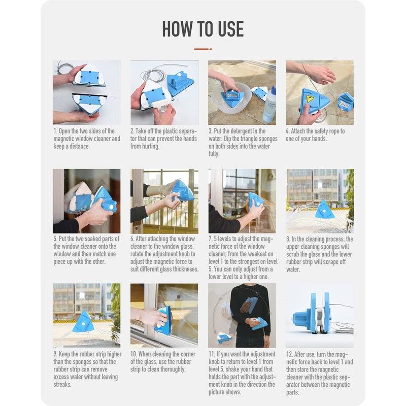 12.After use,must recover the magnet button into 1 gear and then keep two side of glass cleaner together.