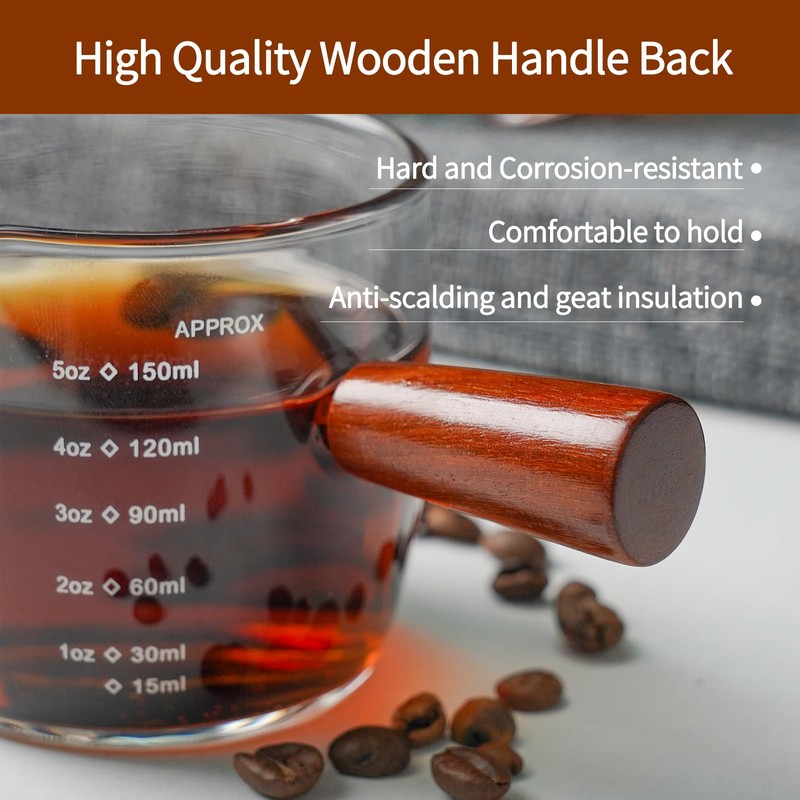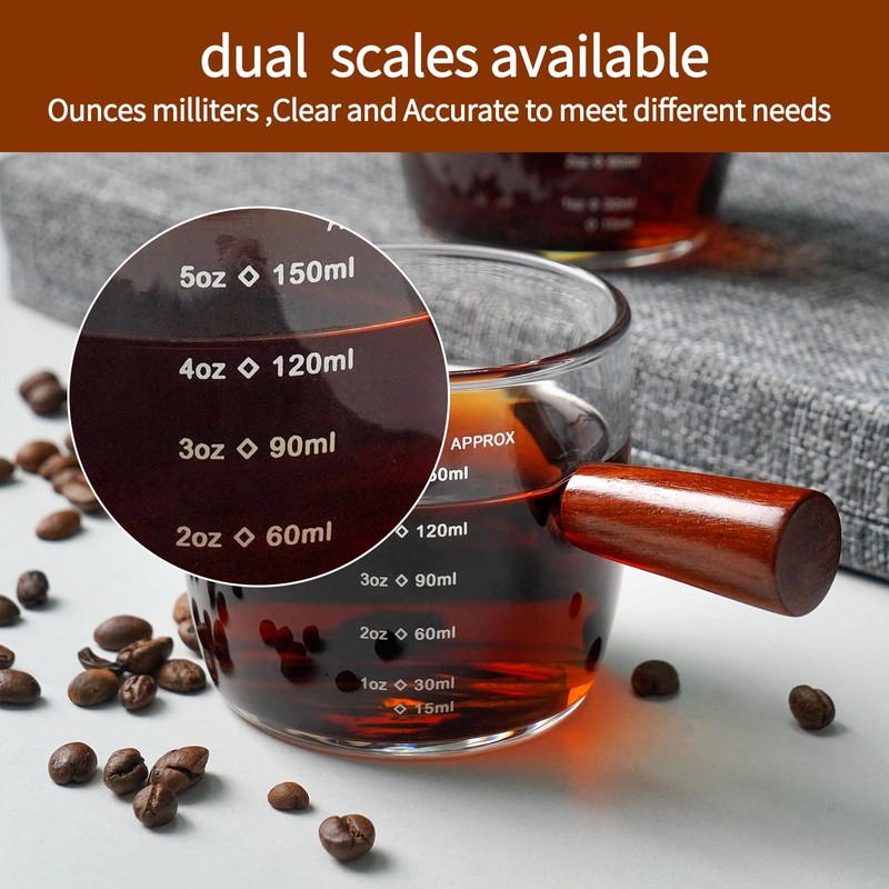 Double Spouts 150ML /5OZ Measuring Triple Pitcher Milk Cup with Wood Handle Espresso Shot Glasses Parts Clear Glass Set of 2 pieces