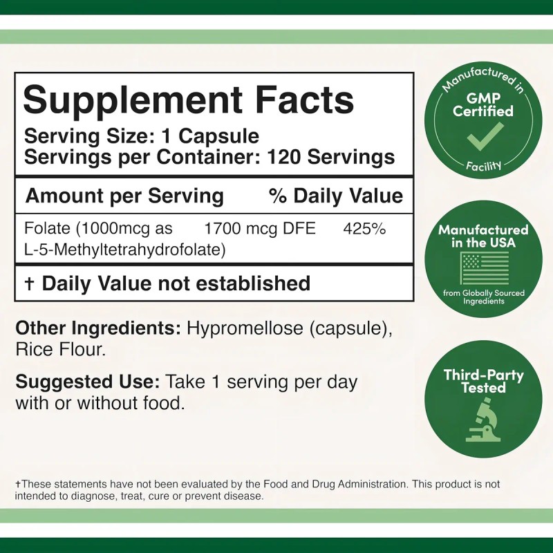Double Wood supplements Metilfolato 1,000mcg 120 cpsulas suplemento de folato de metilo probado por terceros sabor sin sabor