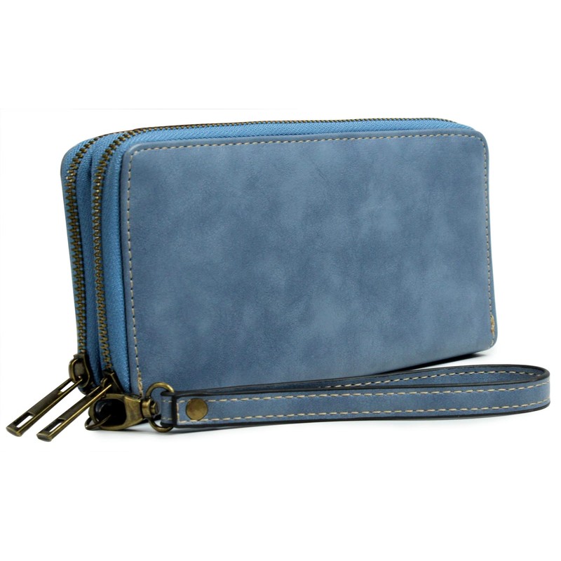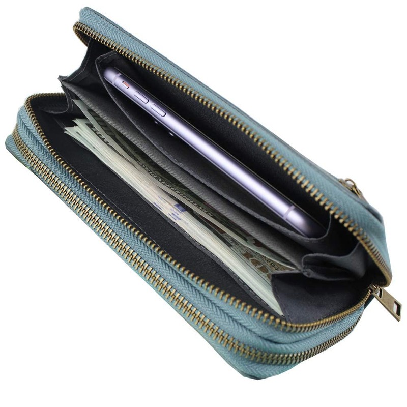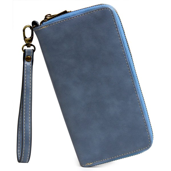 Double Zipper Long Clutch Wallet Cellphone Wallet for Women with Hand Strap for Card, Cash, Coin, Bill, dusty blue, average, Rfid Wallet