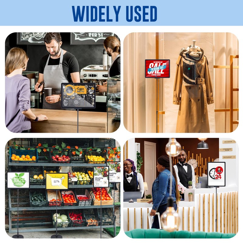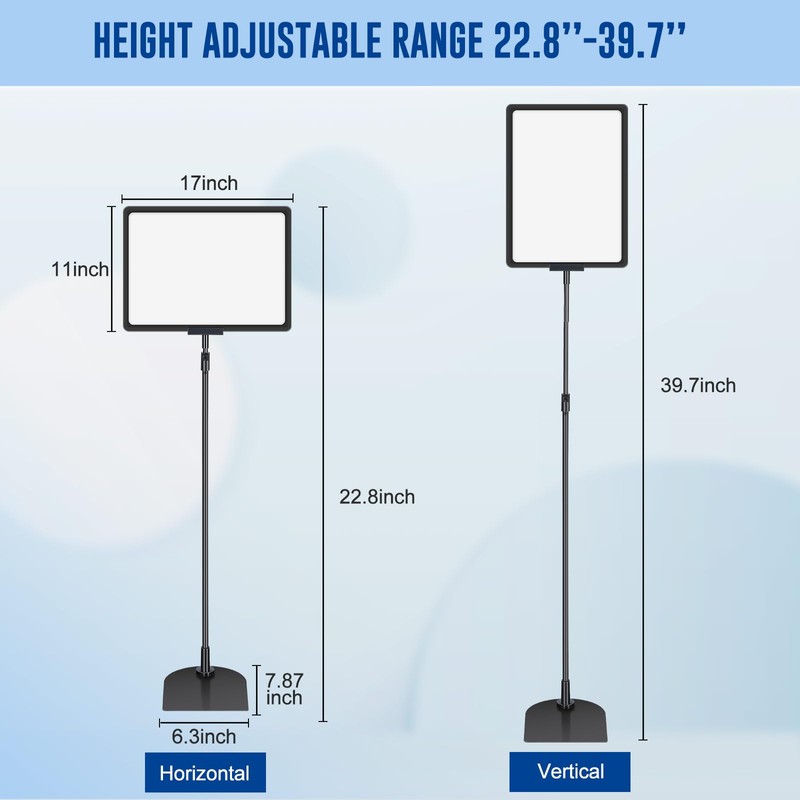 - Generously Sized to Hold Standard Paper: each signage stand can hold standard size papers or cards of approximately 11'' X 17'', offering plenty of space for clear visibility of your displays; The frame can be adjusted to both vertical and horizontal view, allowing for displaying content from multiple angles, suitable for showcasing signs, posters, or advertisements to draw attention effectively