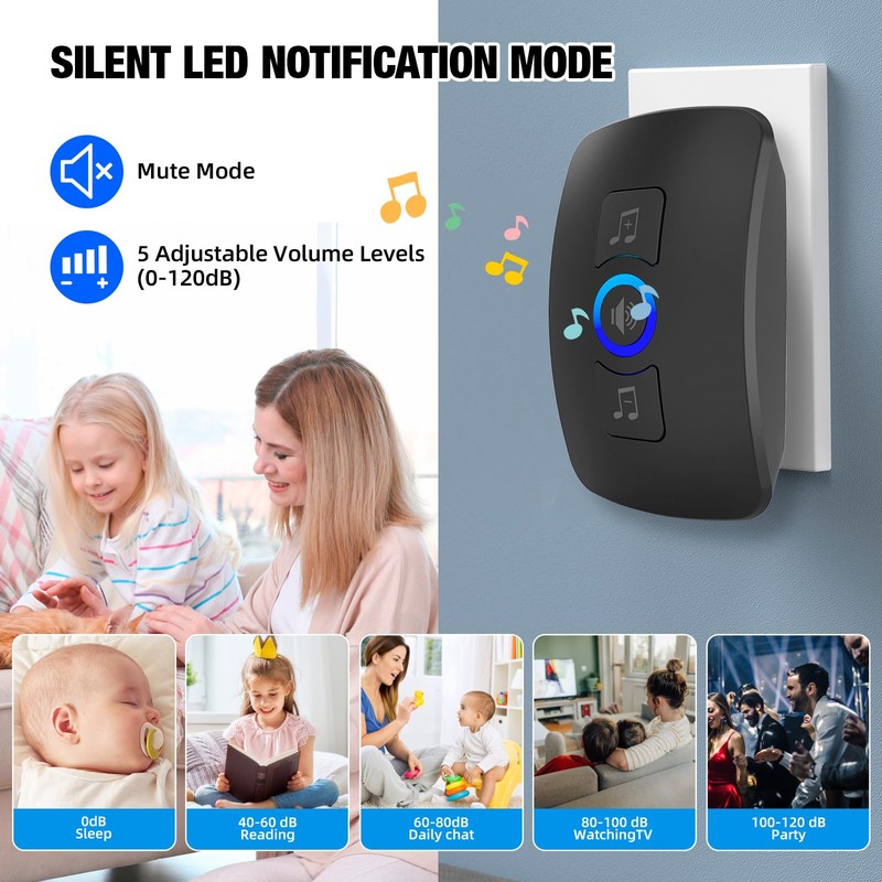- 【Ringtones and Volume】The wireless doorbell has 60 unique ringtones and 5 adjustable volume levels (0 dB to 110 dB) to meet your needs in different occasions. In silent mode, you don't have to worry about the doorbell ringing disturbing your sleeping baby. The LED light of the receiver will still flash so you won't miss your visitors. The high decibel volume of 110 dB can alert the hearing-impaired or the elderly.