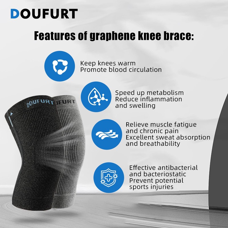 - MATERIAL OF KNEE BRACE: The knee brace contains graphene. The far-infrared rays of graphene can penetrate human tissues, promoting blood circulation, enhancing blood flow, reducing inflammation and knee pain, and accelerating injury healing. DOUFURT knee brace for women & men is a scientifically proven effective knee compression sleeve