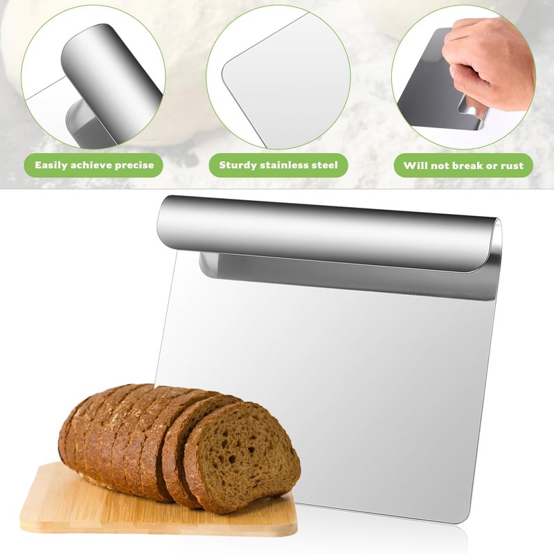 - Versatility: The stainless steel bread scraper is moderately sized and easy to use, suitable for handling sliced vegetables, smoothing cakes, transferring pizzas, kneading dough, cleaning stickers or other stubborn residues on floors/tables/windows, etc