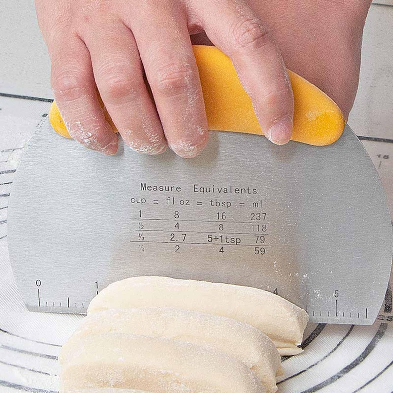 - The dough scraper is made of 0.1 cm 304 stainless steel. Robust, not easy to break or bend. The bold, engraved ruler markings along the blade are easy to read for perfect cuts every time when cooking or baking.?The sharp, non-stick stainless steel blade is crafted to scrape, scoop, cut, chop and more.