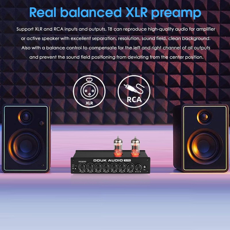 • Real balanced XLR preamp: support XLR and RCA inputs and outputs, T8 can reproduce high-quality audio for amplifier or active speaker with excellent separation, resolution, sound field, clean background. Also with a balance control to compensate for the left and right channel of all outputs and prevent the sound field positioning from deviating from the center position.