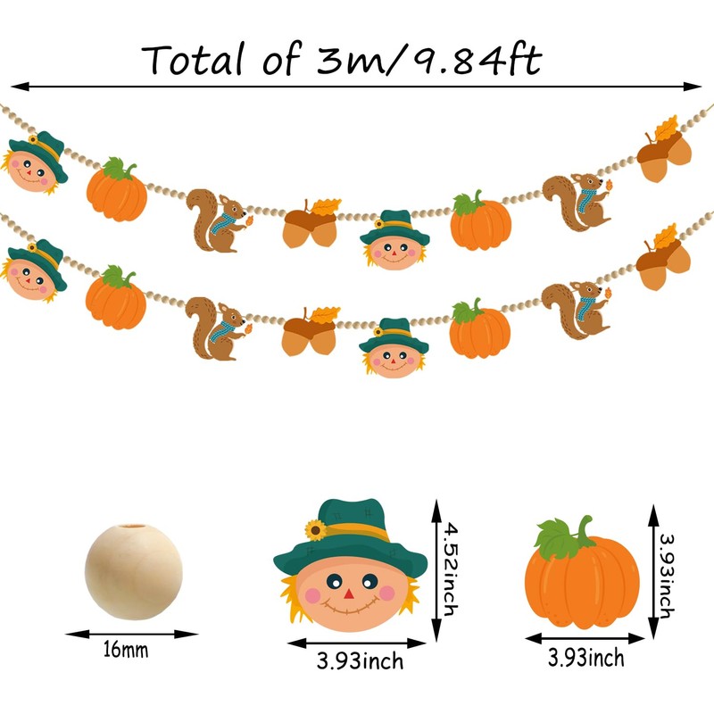 Size: scarecrow- 11.5*10cm, squirrel- 11*10.5cm, pine cones- 9*10.5cm, pumpkin-10*10cm, wooden beads-16mm