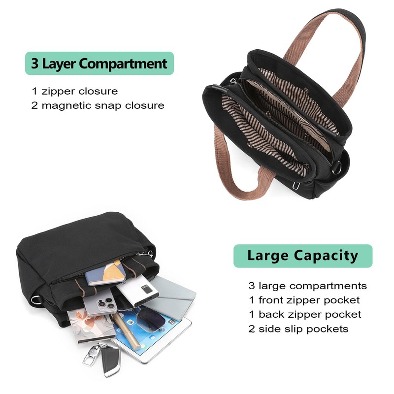 Organized - 3 layer main compartments + front / back zipper pockets + 2 side slip pockets + other inner small pouch. This canvas tote bag can organize your belongings into categories, so you can find them quickly and easily.