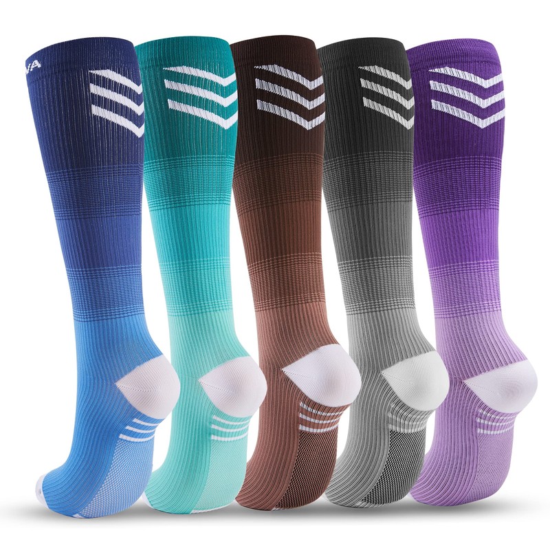 Dovava Stylish compression socks, knee high length in variety patterns and colours. Our compression socks 15 25 mmhg, which have been built with 80% nylon, 10% polyester and 10% Lycra spandex, design with circular textile structure and advanced air ventilation, good moisture control for the whole day breathable. These are the best socks for athletes, nurses, doctors, pregnant women, cyclists, truck drivers and travellers who are on their feet for hours. Help increase blood circulation, reduce pain, fatigue and inflammation. Our compression socks provide significant relief for aching legs, calves, ankles and feet and allow you to manage your edema or DVT in comfort and style. Recover faster from running, training, cycling, basketball, tennis, gym, hiking and other sports activities. Helps prevent varicose veins. Helps prevent DVT and blood clots. Relief of discomfort associated with minor moderate edema, CVI and venous conditions. Suggested machine wash and hand wash suggest using a wash bag. Do not iron. Do not bleach. Do not put socks in hot water or foam for a long time.
