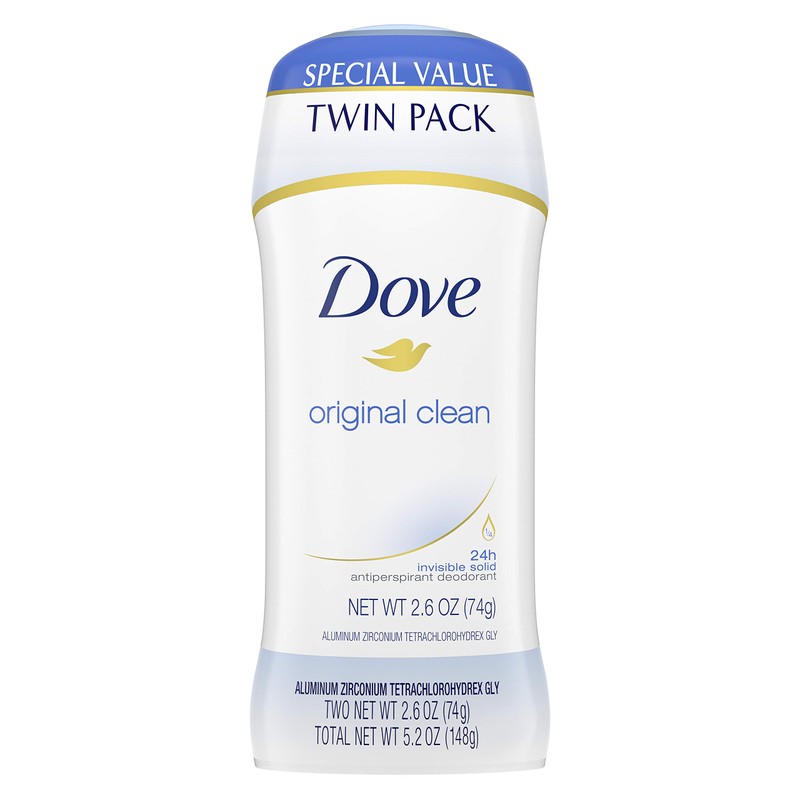 Get a fresh, clean feeling from your antiperspirant deodorant with Dove Invisible Solid Antiperspirant Deodorant Original Clean 2.6 oz, Twin Pack. An invisible solid antiperspirant deodorant with our signature clean scent, it glides on easily and offers up to 24 hours of antiperspirant protection against sweat. Caring to skin, the alcohol (ethanol) free formula contains Dove 1/4 moisturizers to provide great underarm care. This antiperspirant deodorant also helps skin to recover from shaving irritation so that you can enjoy underarms that look and feel softer and smoother. Dove Original Clean is a great antiperspirant for those who love solid deodorants and the familiar, original scent of Dove. Protecting you from sweat for up to 24 hours, this antiperspirant deodorant glides on easily and gives you a fresh start to the morning. For great results use Dove Original Clean after bathing or showering, once skin is cool and dry. Swipe the deodorant stick up and down each underarm two or three times until an even layer is applied to the skin. Enjoy the clean, original scent of Dove and the reassurance that comes with up to 24 hours of protection from your Dove Original Clean. At Dove, our vision is of a world where beauty is a source of confidence, and not anxiety. So, we are on a mission to help the next generation of women develop a positive relationship with the way they look - helping them raise their self-esteem and realize their full potential.