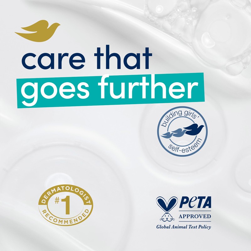 - CARE WITH YOUR CLEANSER: Globally, Dove does not test on animals and is PETA Approved. Our mission is to help the next generation of women develop a positive relationship with the way they look.