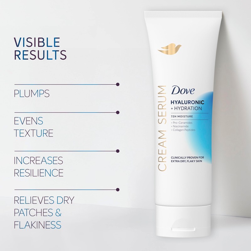 - SCIENCE-BACKED: Dove Cream Serums are clinically tested for efficacy and safety for all skin types and tailored to include powerful ingredients scientifically evidenced to provide visible benefits to skin.